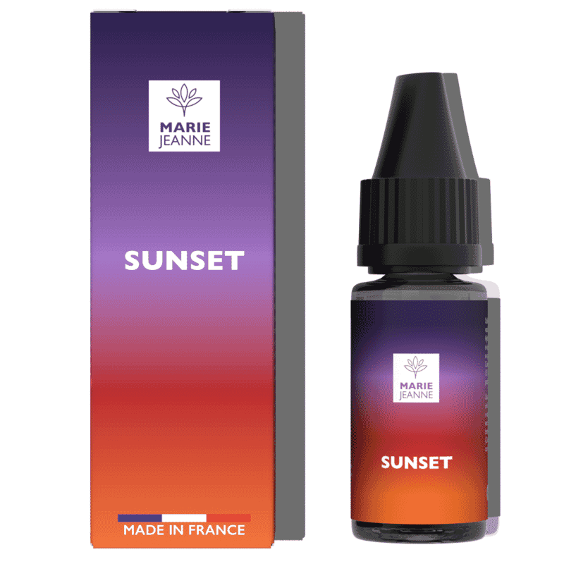 The Marie Jeanne Sunset CBD e-liquid comes in a 10 ml bottle with a childproof lid. It stands out thanks to its colourful bottle, which evokes the colours of the sky during a summer sunset.