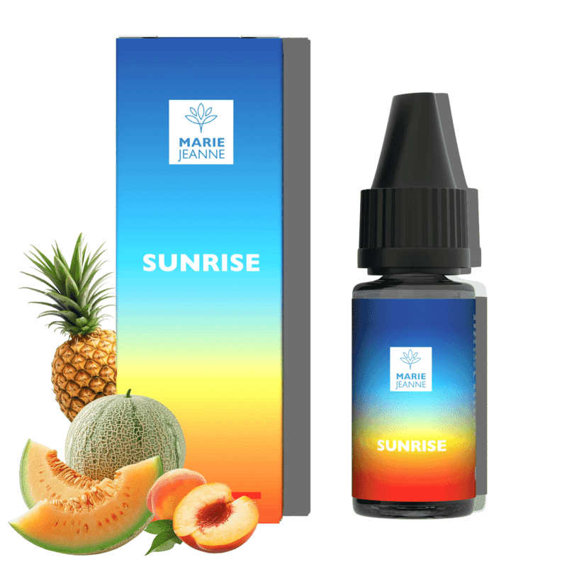 Marie Jeanne's CBD e-liquid Sunrise is presented in a 10ml bottle sealed with a secure cap. It is recognizable by the design of its colorful bottle, with a gradient resembling the light created by a sunrise.